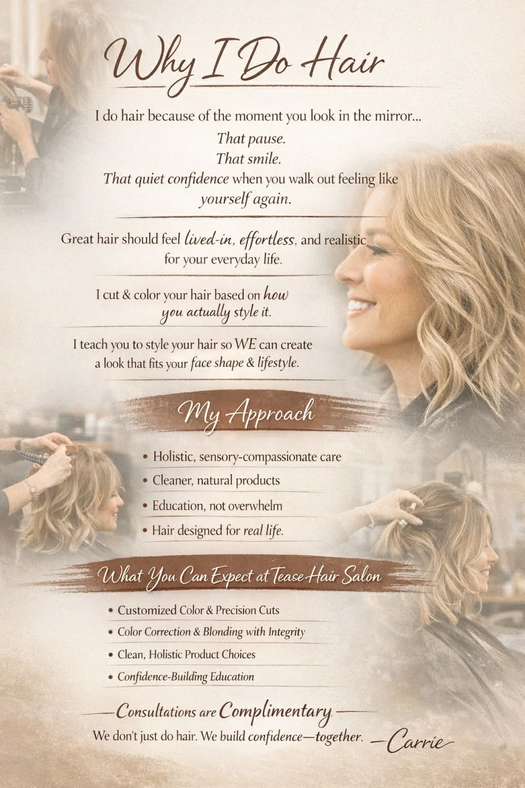 Our team of skilled hair artists is trained in the latest techniques and trends, ensuring every guest receives personalized service and leaves feeling confident and refreshed. At Tease Hair Salon, we believe great hair is about more than just style — it’s about creating an experience that makes you feel your best.